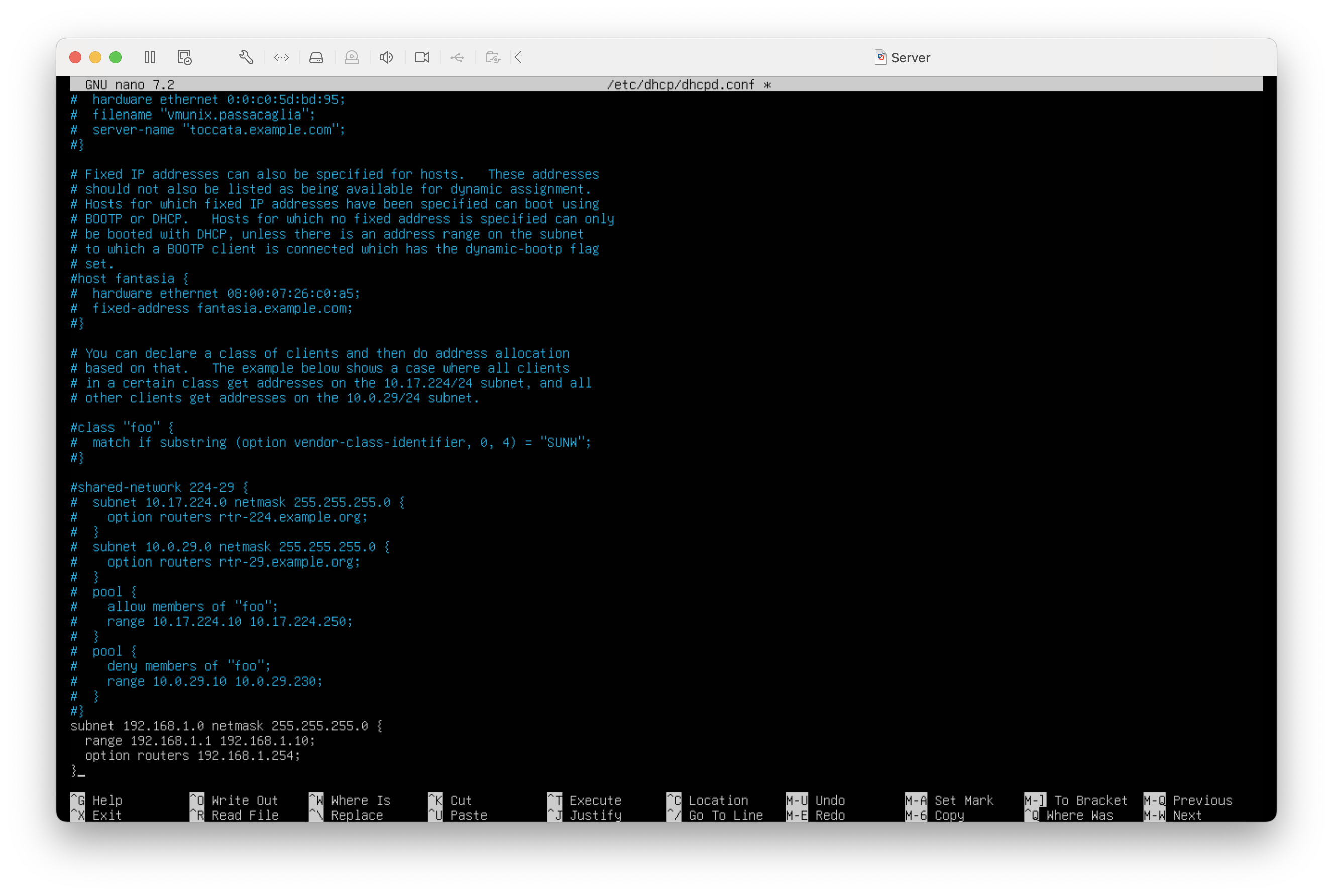 이후 텍스트 편집기로 /etc/dhcp/dhcp.conf에 있는 파일에 subnet을 지정하고, range로 ip할당 범위를 설정할 수 있다. (option router 속성으로 게이트웨이를 지정할 수 있다.)