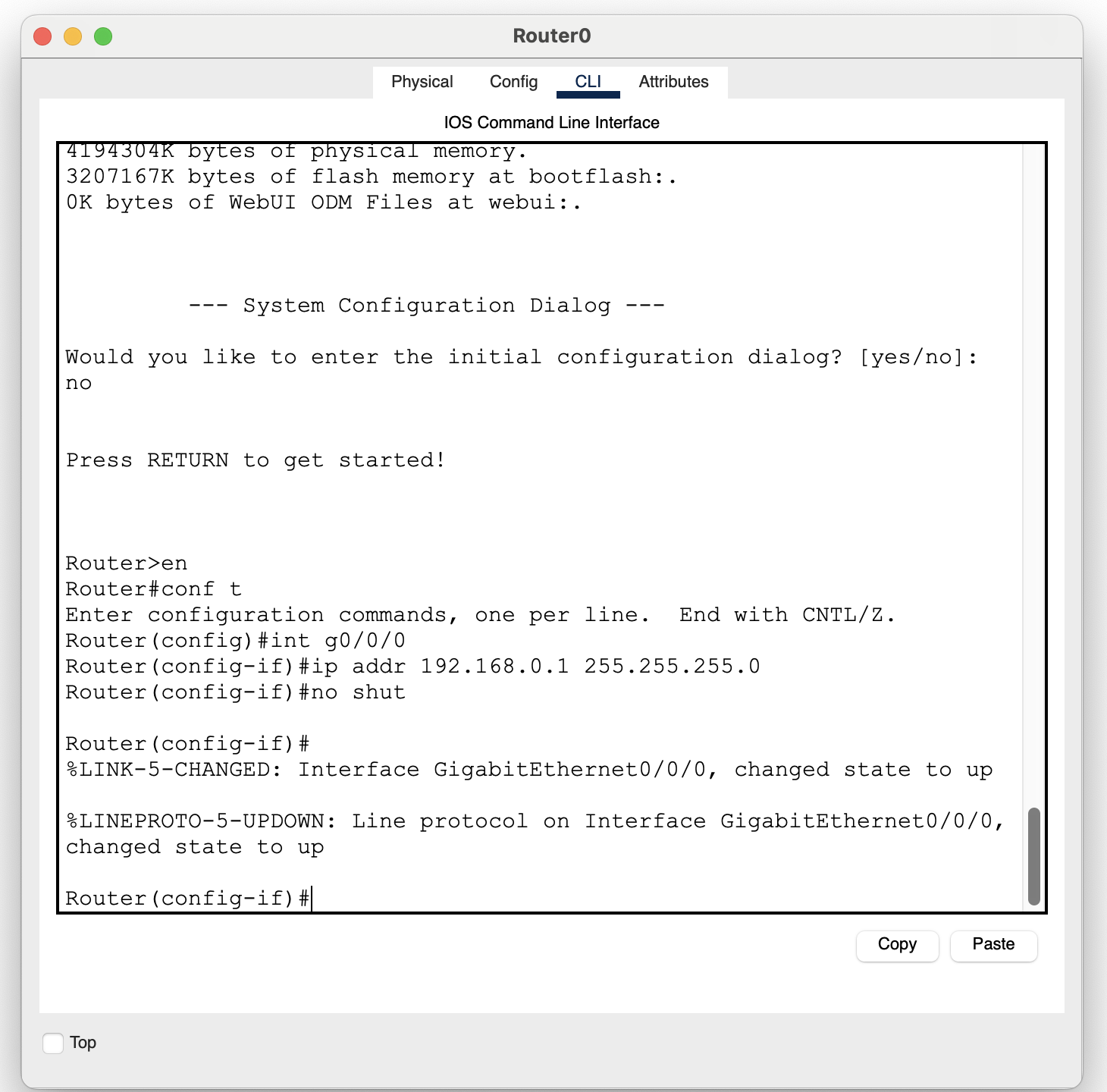 이 과정을 마치면 g0/0/0(PC랑 연결된 부분)을 활성화하는데 성공한 것이다.