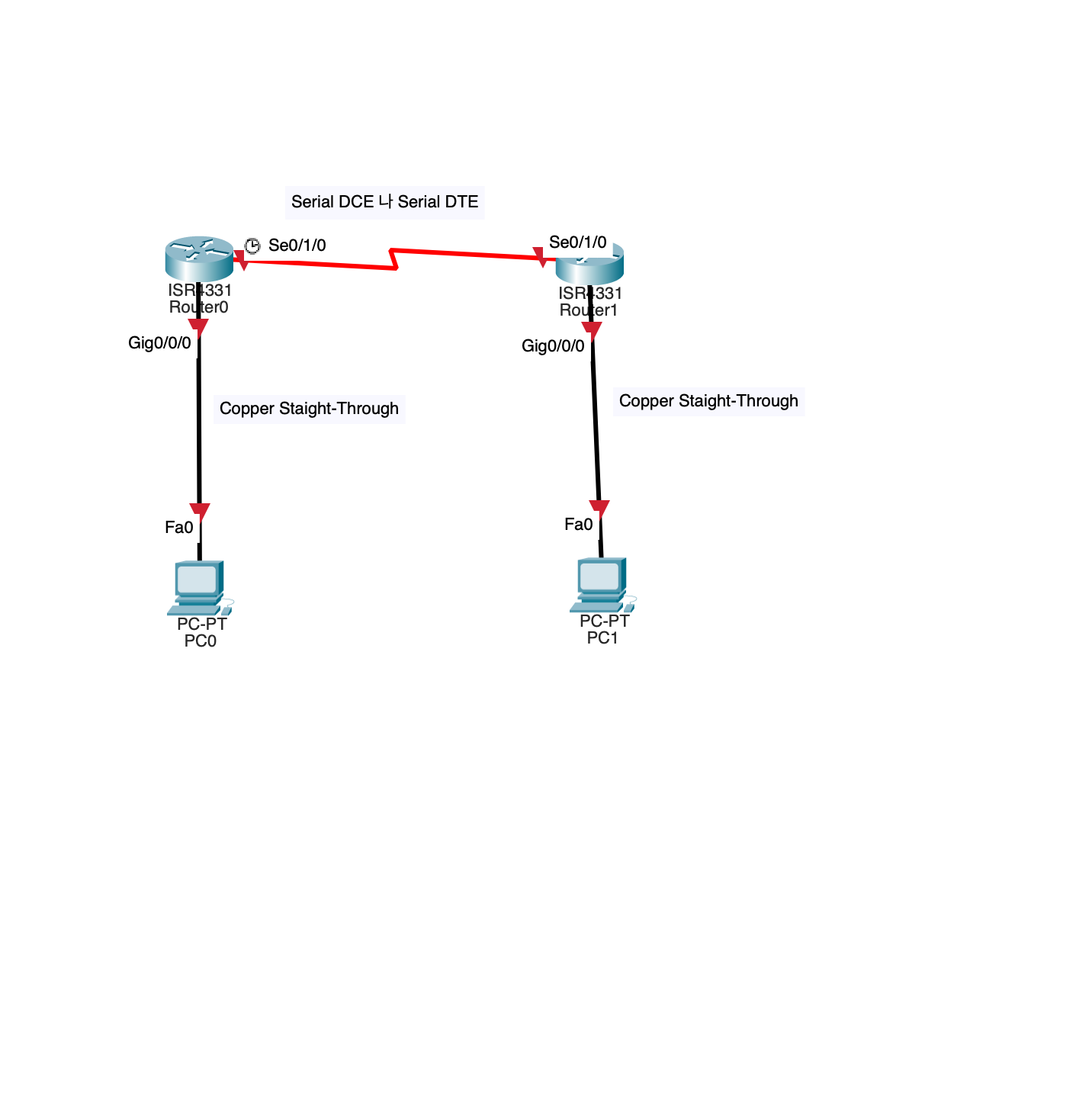 왼쪽 밑 4번째 연결 부분에서 PC와 라우터 사이는 Copper Straight-Through 케이블로(검은 사선 모양), 라우터와 라우터 사이는 Serial DCE나 Serial DTE 케이블(빨간 번개 모양 또난 빨간 번개 모양과 시계 모양)로 연결한다.