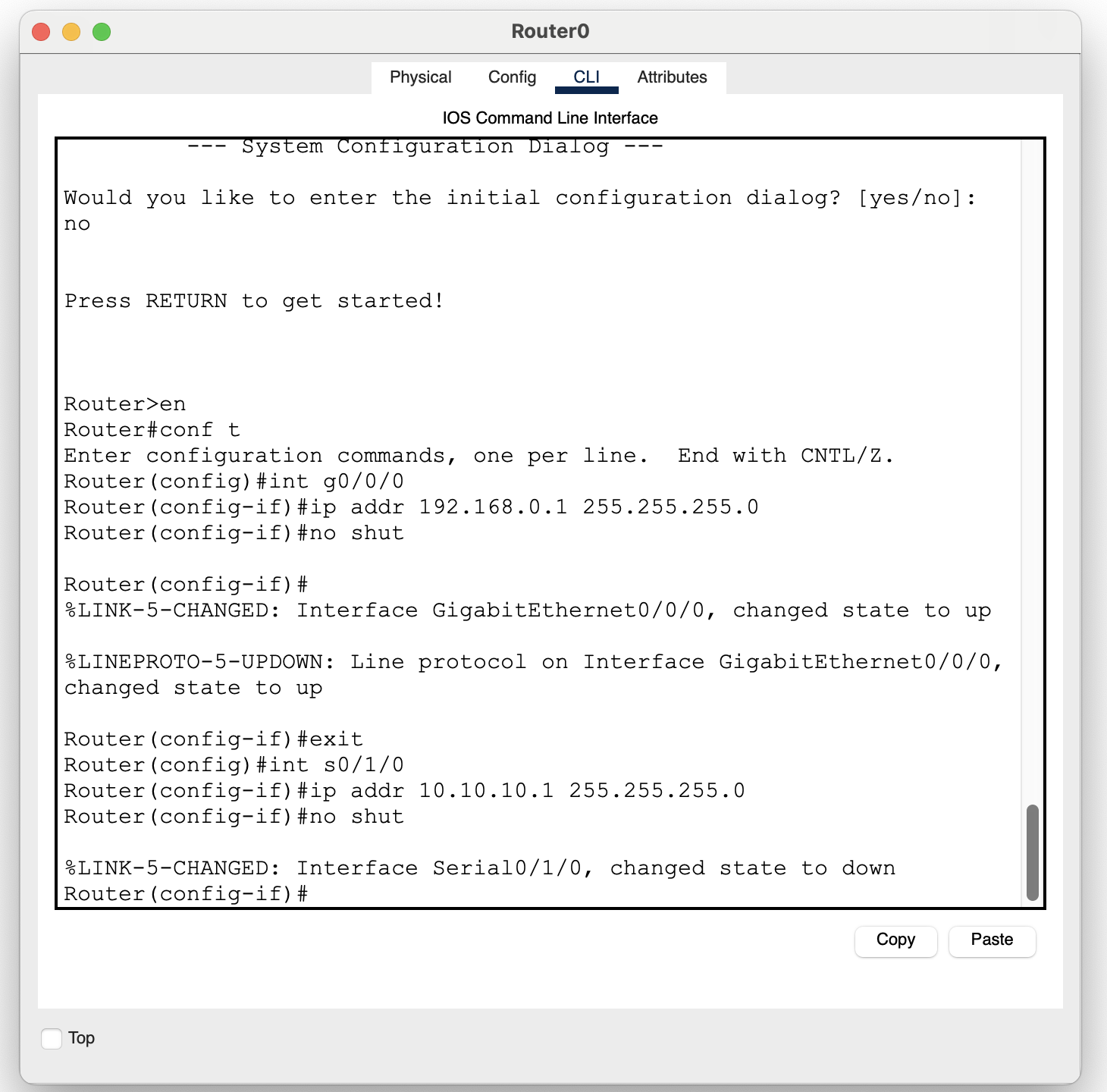다시 왼쪽 라우터를 클릭한 다음 다음 명령어로 라우터와 라우터 사이 포트, 라우터와 PC사이의 포트를 활성화 시킨다.