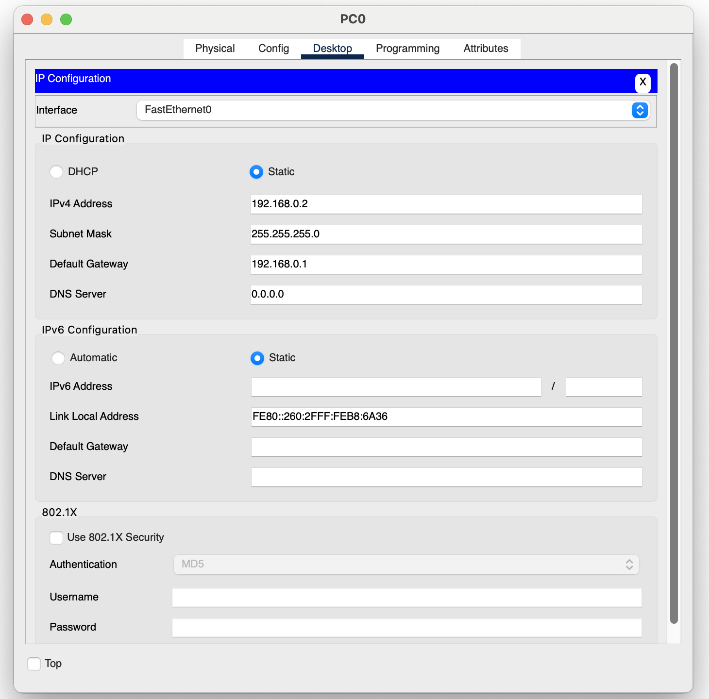 지금은 단순히 ip를 192.168.0.2로 설정하였고, 서브넷 마스크는 라우터와 동일한 255.255.255.0으로 하였다.