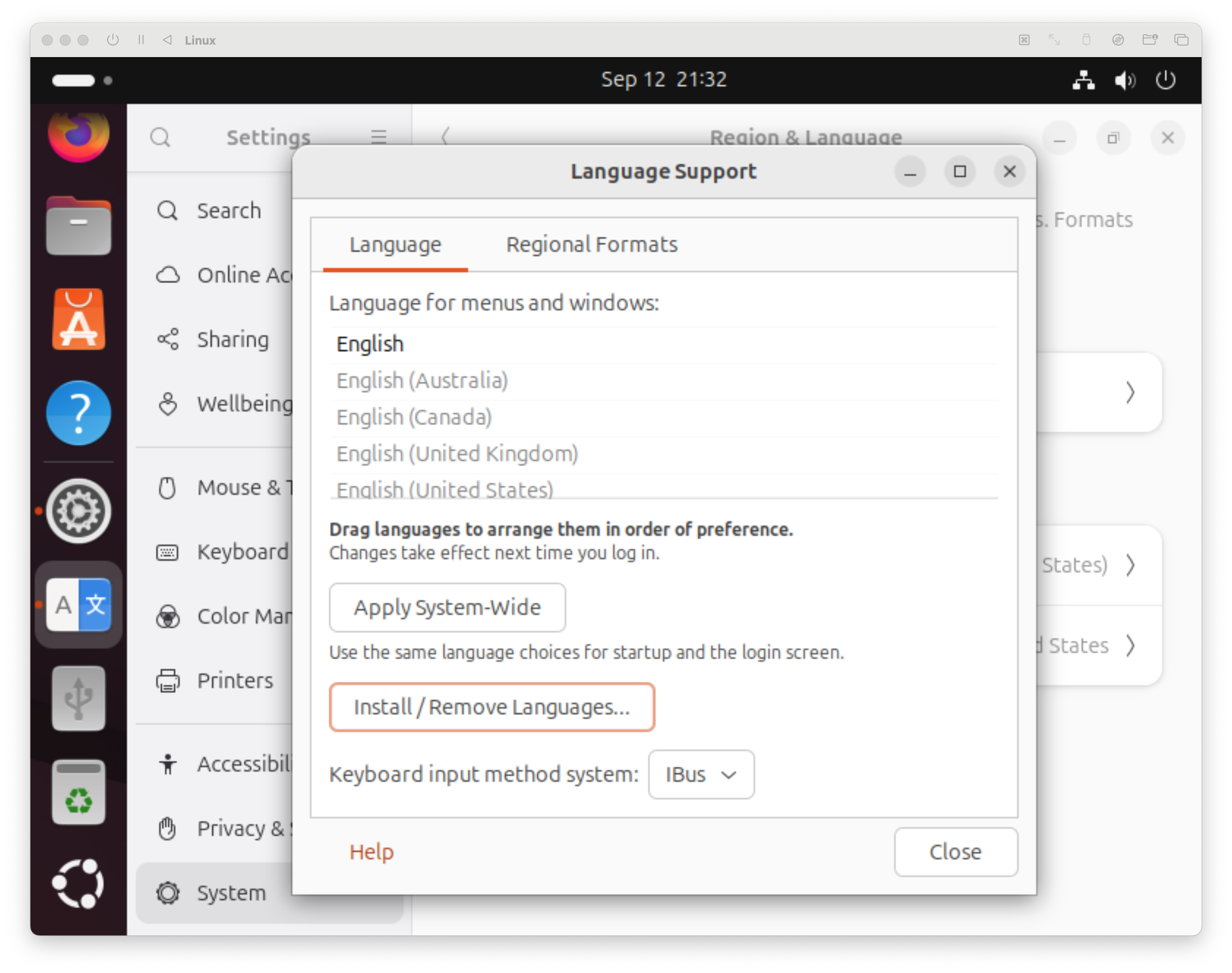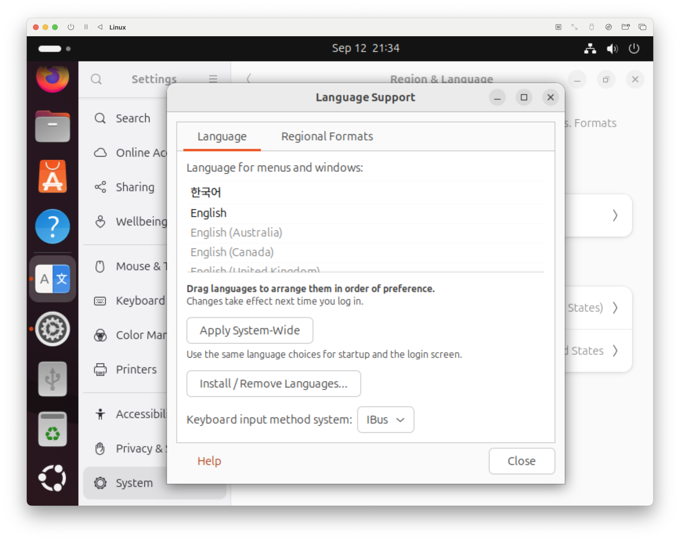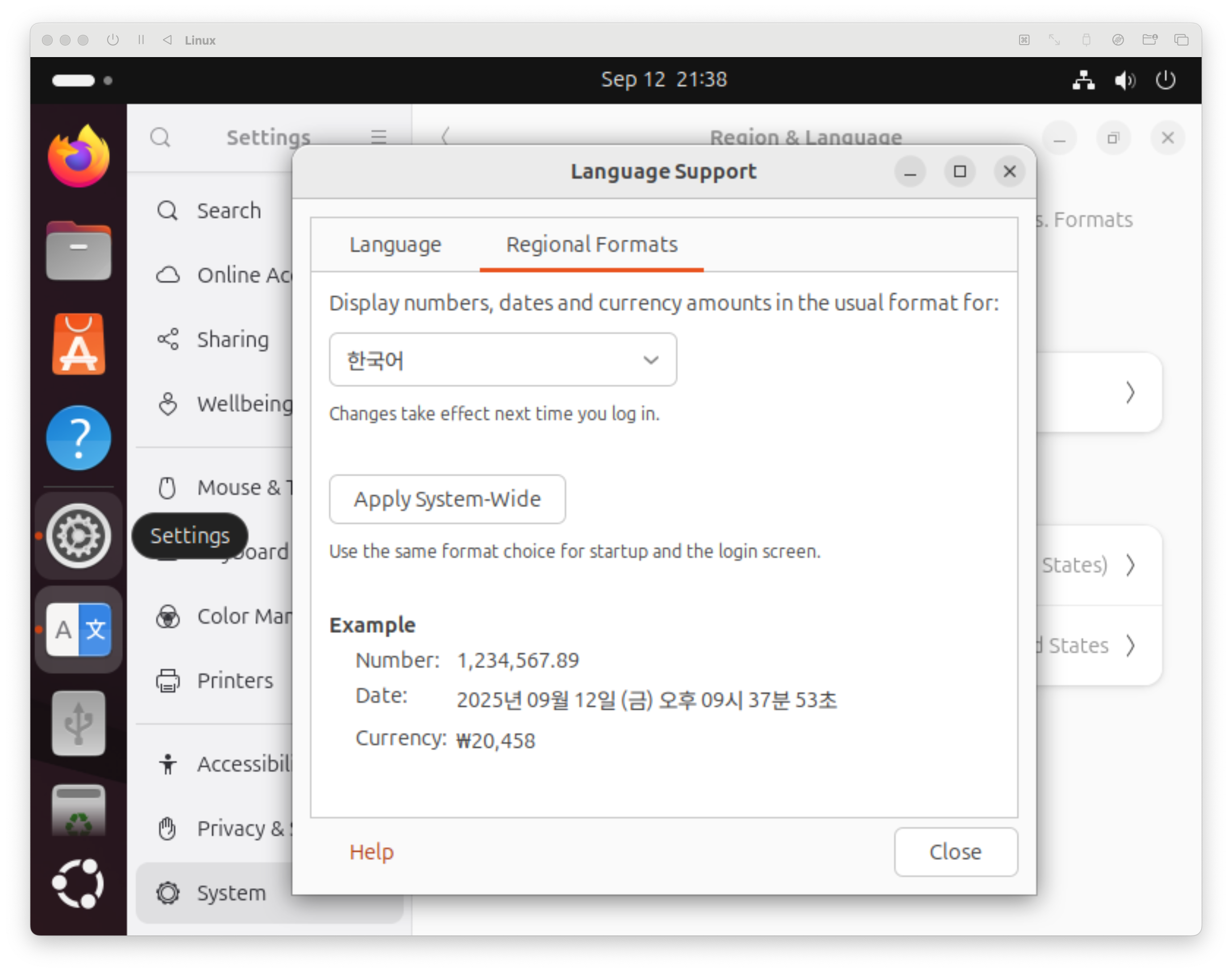 Regional Formats 메뉴에 들어간 다음 English를 한국어로 바꾸고, Apply System-Wide 버튼을 누른다.