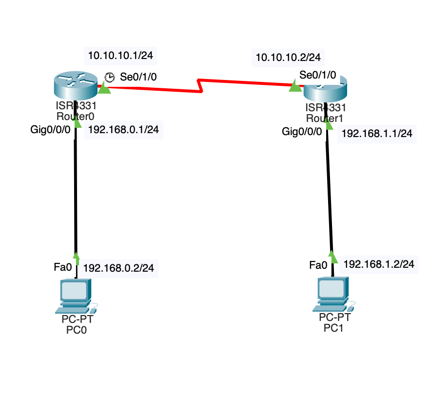 라우팅은 라우터가 데이터를 목적기까지 보내는 최적의 경로를 선택하는 과정이다. 라우팅은 라우팅 테이블로 관리되며, 라우팅은 크게 2가지로 나뉜다.정적 라우팅라우터 관리자가 직접 경로를 설정하는 방식이다. 이 방식은 동적 라우팅에 비해 다소 복잡하고, 설정하기 어렵다. 따라서 일부 기업용 네트워크를 제외한 곳에서는 동적 라우팅을 사용한다.동적 라우팅라우터가 자동으로 경로를 설정하는 방식이다. 이 방식은 정적 라우팅과 달리 설정할 필요가 없기 때문에 편리하다.참고) 기본 라우팅정적 라우팅 방법 중 하나로, 기본적으로 모든 패킷을 다른 라우터로 전송하는 방식이다.이 부분을 실습하기 위해 cisco의 packet tracer를 사용할 것이다. 라우터 2개와 PC 2를 꺼낸다.(모든 장비는 왼쪽 아래에 있고, 라..
